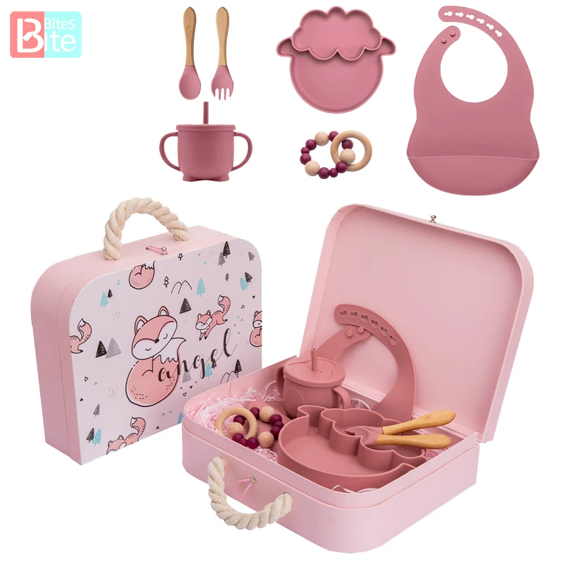 Name: Vajilla de alimentación de silicona para bebé, juegos de alimentación con caja exquisita, vajilla antideslizante de grado alimenticio, sin BPA, para regalos de nacimiento